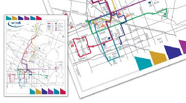 HWDS created this overlay of all bus routes in the City of Norwalk, CA so that riders can easily see and compare all of the routes at the same time. This map is currently being used online. We used a very simple and clean design to make this a very-user friendly map.