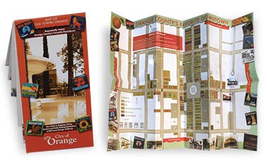 For several years now, we have been designing and updating the Old Towne Orange Map for this historic district nestled in the heart of downtown Orange, CA. To give this a look of the time period, we designed this map using historic orange crate labels direct from the City’s library archives and then layered these on top of some antique textured backgrounds. This map received praise from merchants, as well as City officials.