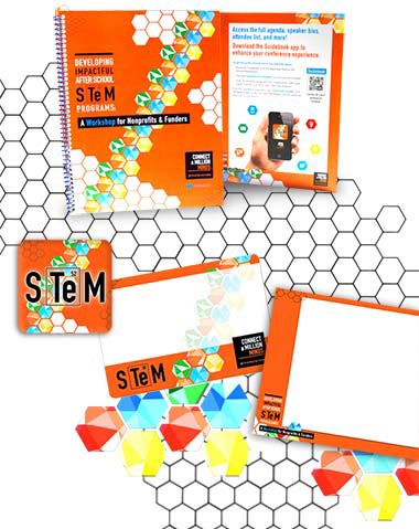 HWDS created these very unique event materials for a Time Warner Cable seminar on professions closely associated with science, technology, engineering and math (STEM). We created a unique identity for the event using colorful modular cell-like graphics and a logo developed from the Periodic Table of chemical compounds. We used this identity to create a program packet, advertisements, name badges, Power Point show and mobile app button for the Internet.